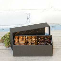 Trio d'amandes très gourmandes : Amandes au caramel d'Isigny et fleur de sel, Amandes enrobées d'un chocolat blond, Amandes caramélisées au chocolat noir. 180g. Fabriqués en France.