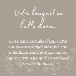 Votre bouquet est ainsi accompagné de sa bulle d'eau dans son porte bouquet en papier carton, adapté pour tout type de bouquet, il permettra au destinataire de votre charmante création de le mettre en eau à réception de celui-ci.